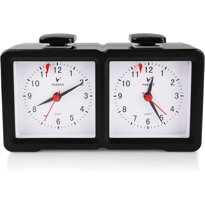 This clock features two separate clock faces on the same chess clock, one for each player, with two buttons at the top for each player to press. With analog clocks, you typically set the time on each clock individually. It is suitable for all kinds of chess game timing clocks. Durable plastic casing, lightweight and portable.