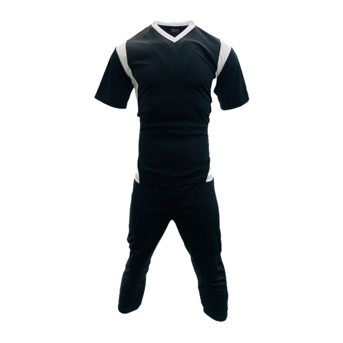 Made from lightweight, breathable polyester, the kit offers moisture-wicking comfort to keep players cool and dry. The design features a bold solid colour on the front and back, contrasted by differently coloured side panels and neckline. A subtle stripe between the sleeve and side section blends seamlessly with the body colour, giving the kit a sharp, modern finish.
